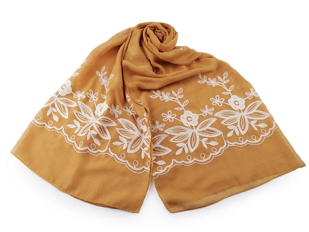 Vzdušnou šálu zdobí na obou koncích květinová výšivka. Šálu si můžete vzít jako doplněk ke kabátům, svetrům, tričkům i šatům. Je příjemná na dotek.