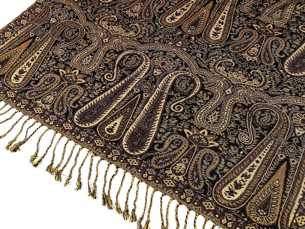 Elegantní šátek s orientálním vzorem vás okouzlí na pohled i dotek. Je oboustranný, jedna strana je tmavá, druhá světlá. Šátek je příjemně hebký, oceníte jej celoročně na každý den. Můžete jej nosit do práce i do společnosti, jeho elegantní vzhled váš outfit dokonale dozdobí. Vzor na šátku vznikl tkaním díky preciznímu křížení barevných vláken. Konce šátku jsou ozdobené třásněmi.