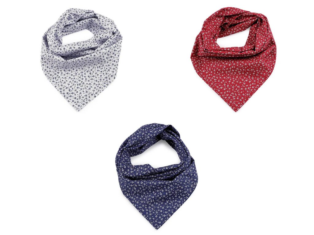Bavlněný šátek zdobí potisk drobných květů. Bavlna zajišťuje příjemný pocit na pokožce a zároveň je dostatečně pevná a odolná. Šátek můžete nosit nejen kolem krku, ale i jako pokrývku hlavy.