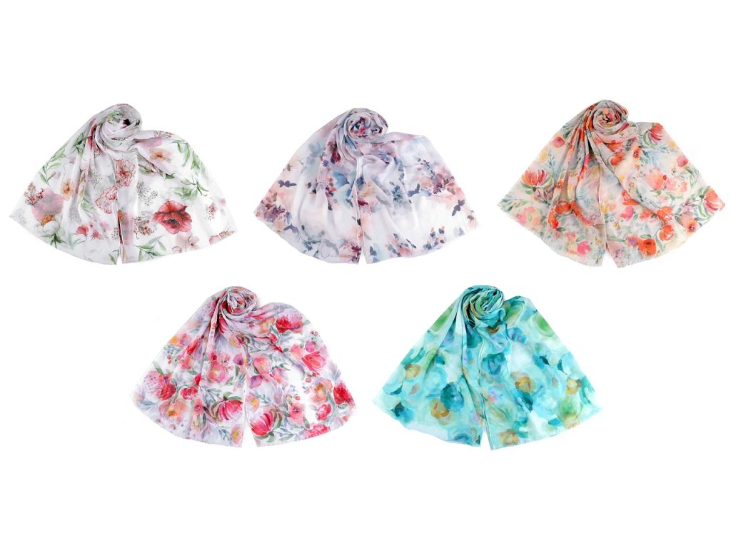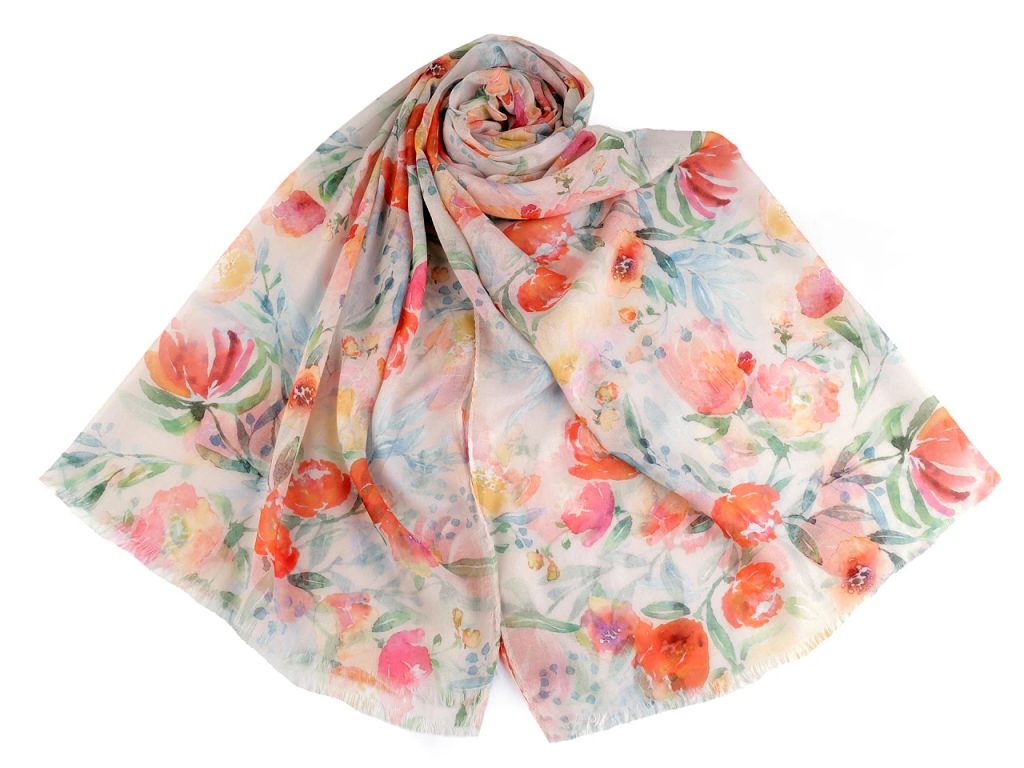 Šátek se vzorem barevných malovaných květů je lehounký a vzdušný, velice příjemný na dotek. Je jemně průsvitný, na koncích má jemné třásně. Doladí váš outfit, ať už si vezmete sako, halenku, svetřík či šaty.