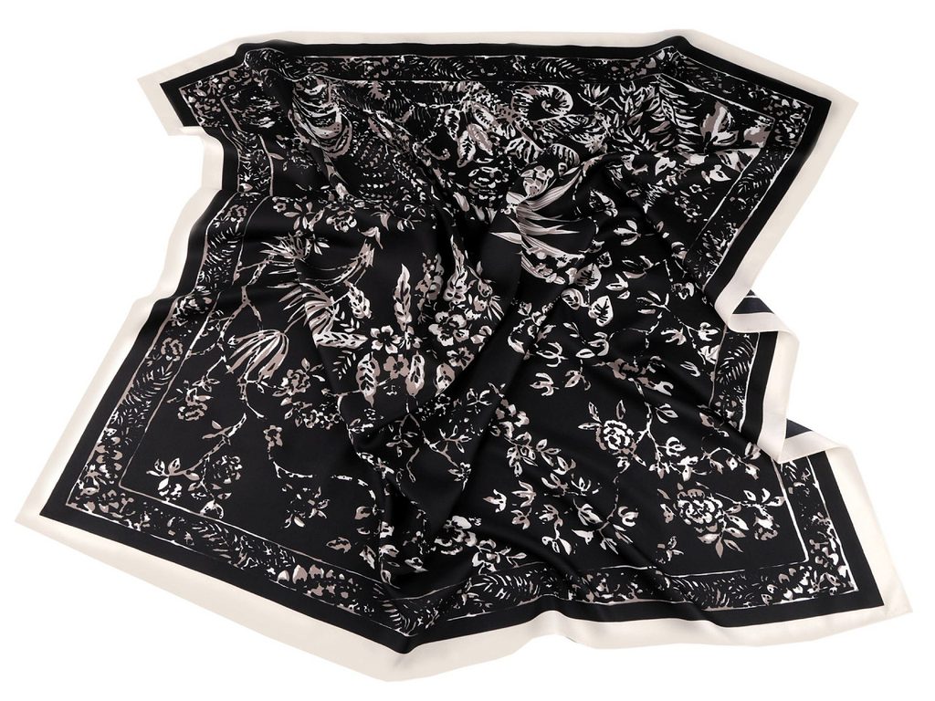 Velký saténový šátek s motivem větviček a květů využijete na každodenní nošení. Je lehounký a měkký, doslova vás bude hýčkat, protože na dotek připomíná hedvábí. Šátek můžete uvázat do slušivého uzlu, který podtrhne eleganci vašeho oděvu. Šátek je jednostranný.