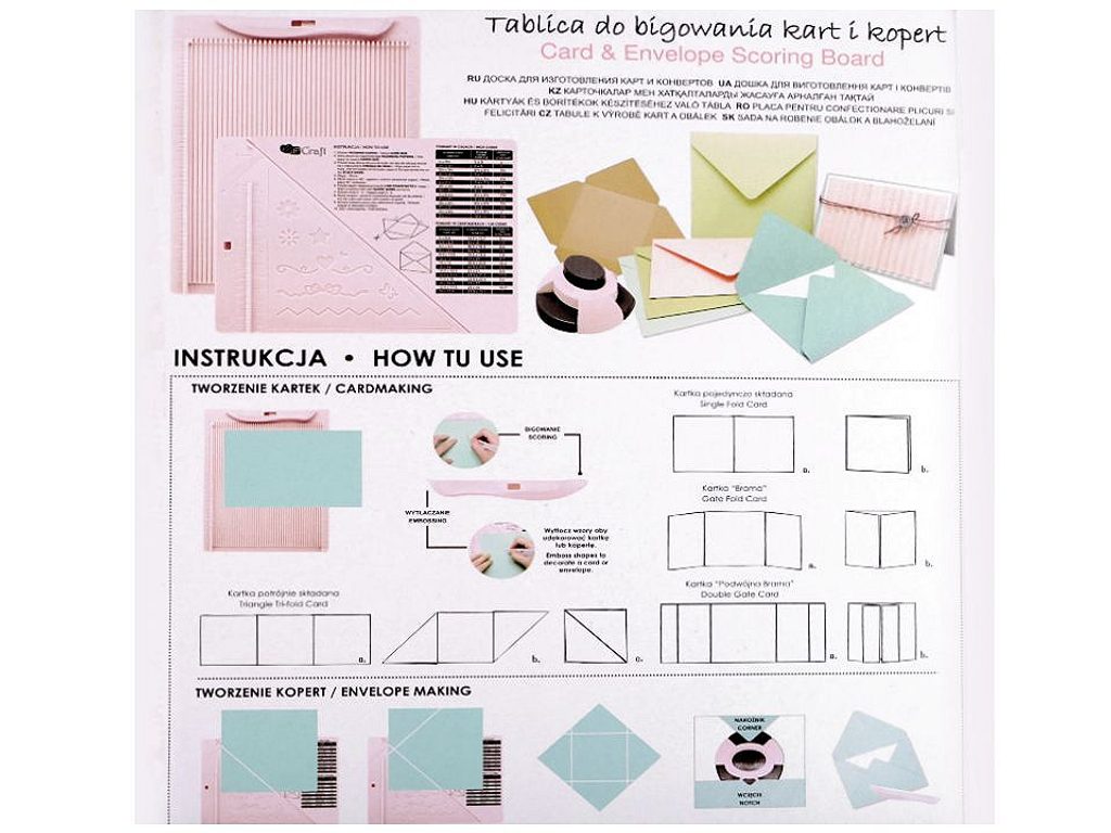 Balení obsahuje: oboustrannou rýhovací podložku, plastové rýhovadlo, rohovou raznici na papír, obrázkový návod na výrobu obálek a přáníček.