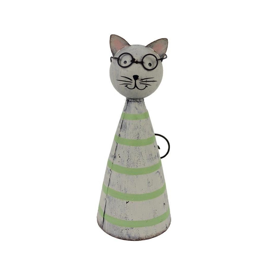 Dekorační kočka. Rozměry : průměr 7 cm, výška 16 cm. Barva : kombinace bílá se zelenou. Materiál : kov.