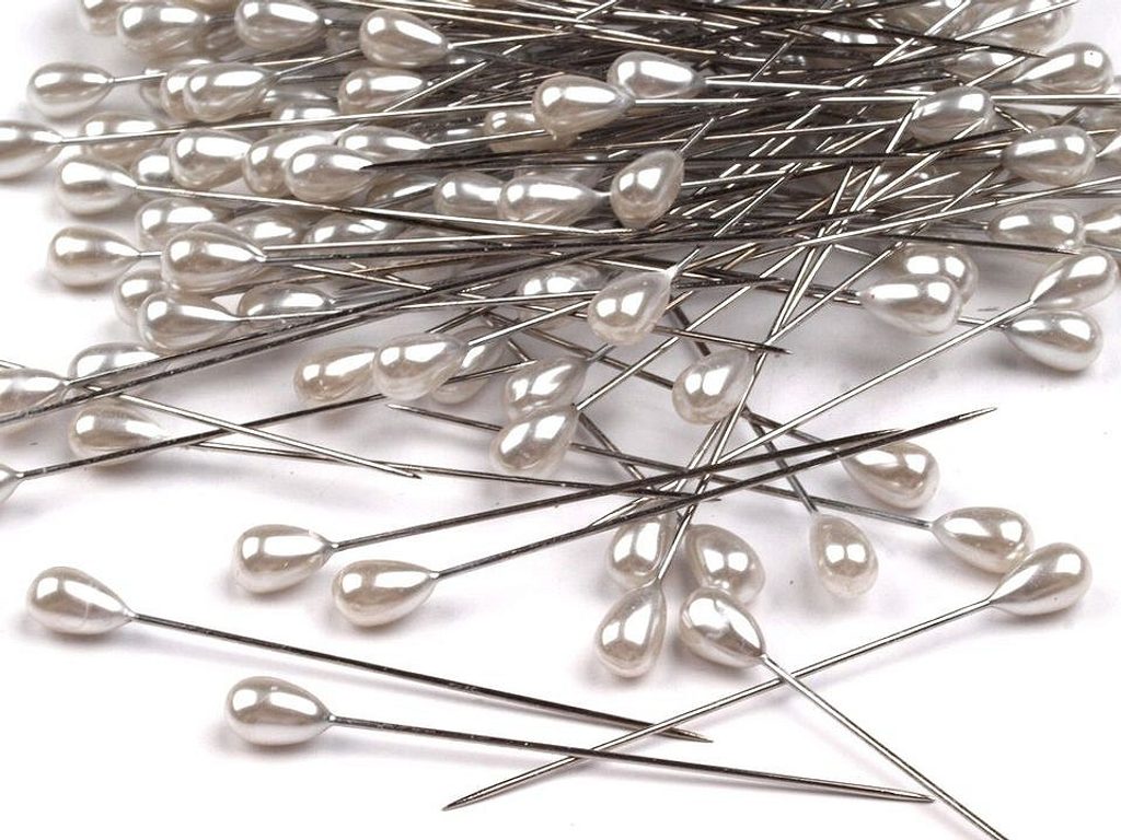 Dekorační špendlík má perleťovou hlavičku ve tvaru kapky. Kloboukový špendlík slouží jako ozdoba k upevnění dekorace např. do aranžmá živých květů, na slavnostní tabule, atd. [Špendlík je pružný.]