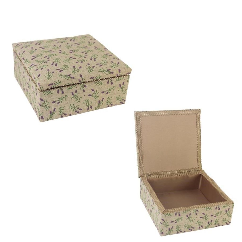 Dárková šperkovnice. Rozměry : 19,5 x 19,5 cm, výška 8,7 cm. Barva : hnědá s levandulí. Materiál : dřevěná konstrukce, textil.