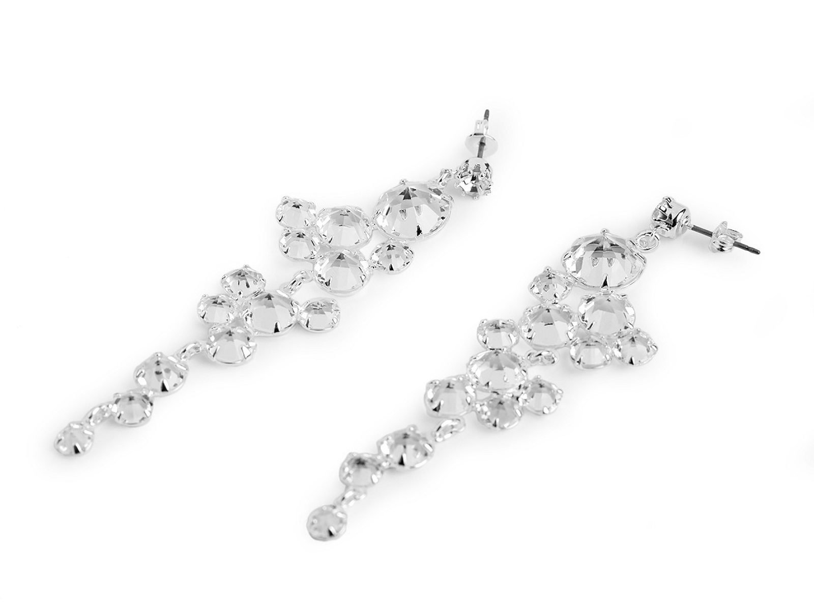 Dlouhé elegantní náušnice ozdobené broušenými kamínky jsou velice výrazné. Jsou nepřehlédnutelné, hodí se na speciální příležitosti. Skleněné broušené kamínky prvotřídní české kvality jsou pevně zasazené do kovového lůžka. Na slunci i umělém světle se náušnice zajímavě třpytí. Kov na náušnicích má povrchovou úpravu se stříbrnou galvanizací.