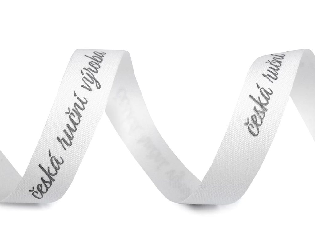 Bavlněnou stuhu zdobí nápis česká ruční výroba nebo nápis slovenská ručná výroba. Český nápis je dlouhý 6,5 cm, slovenský 8 cm. Stuha je jednostranná, pevná a příjemná na dotek.