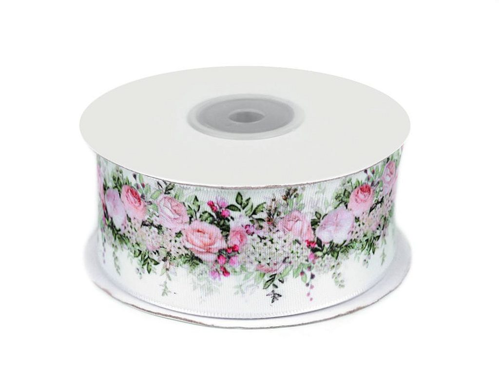 Stuha s potiskem růží je vhodná k dekoračním účelům. Stuha je matná s jednostranným motivem, a svou strukturou připomíná taftovou stuhu. Ze zadní strany je stuha saténová.