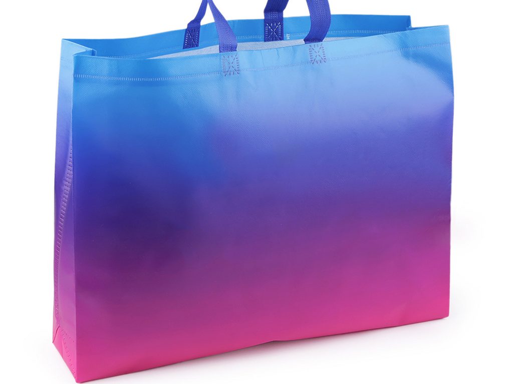 Velká taška z netkané textilie vás nadchne svým velkým prostorem. Má dvě ucha, dá se složit třeba do kabelky. Díky opakovanému používání je šetrná k životnímu prostředí, stále častěji nahrazuje igelitové tašky. Hodí se k reklamním účelům. Není určená na těžké nákupy.