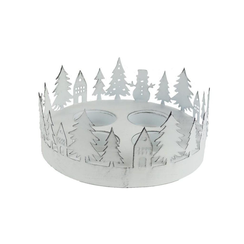 Adventní svícen na 4 svíčky. Rozměry: průměr 16 cm, výška 7 cm. Barva: bílá. Materiál: kov.