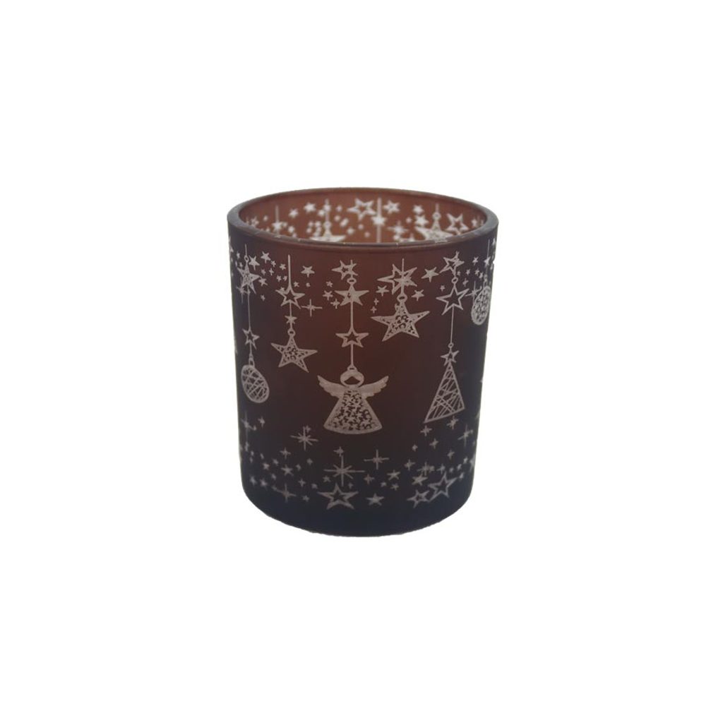 Dekorační svícen. Rozměry : průměr 7 cm, výška 8 cm. Barva : kombinace hnědá, bílá. Materiál : sklo.