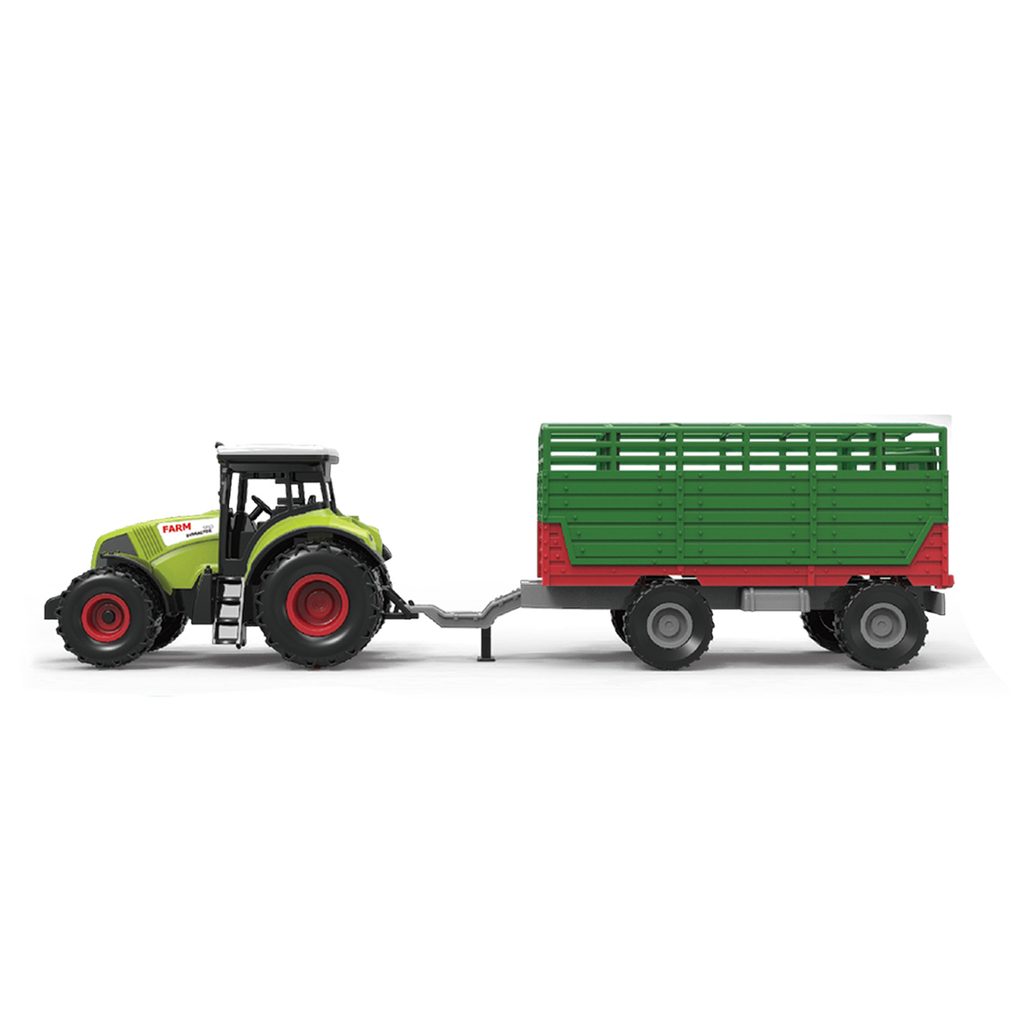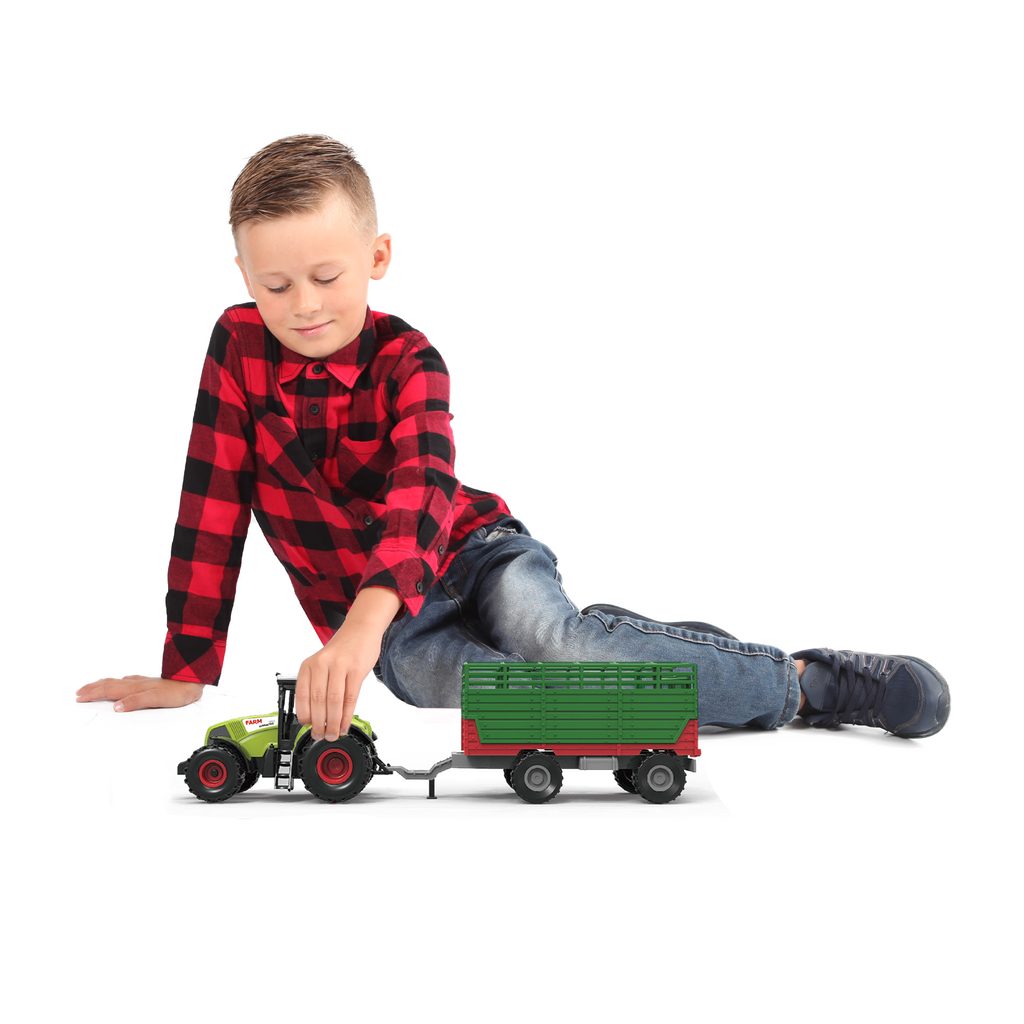 Moderní plastový traktor s vlečkou na seno. Nepostradatelný pomocník pro každého malého farmáře! Vlečku můžeš jednoduše odpojit a traktor využít k dalším pracím. Traktor jezdí na setrvačník a jeho délka včetně přívěsu je 37 cm. Zmáčknutím tlačítek traktor vydává reálné zvuky. Traktor vyžaduje 3 ks baterií typu AG13/LR44, které jsou součástí balení.