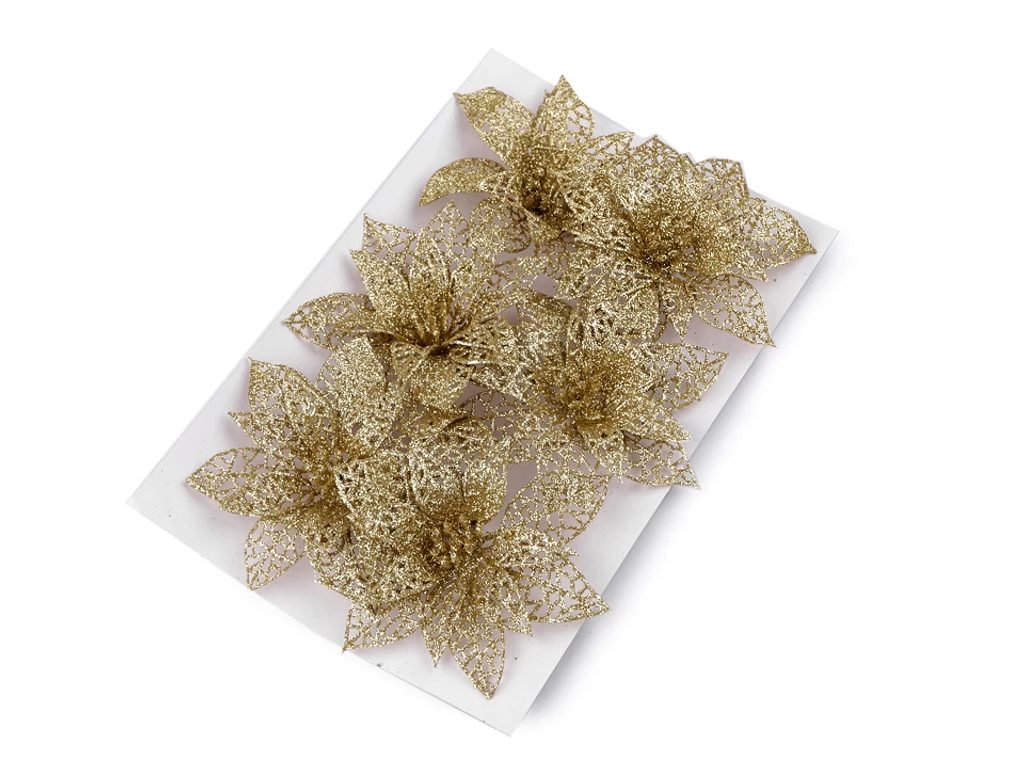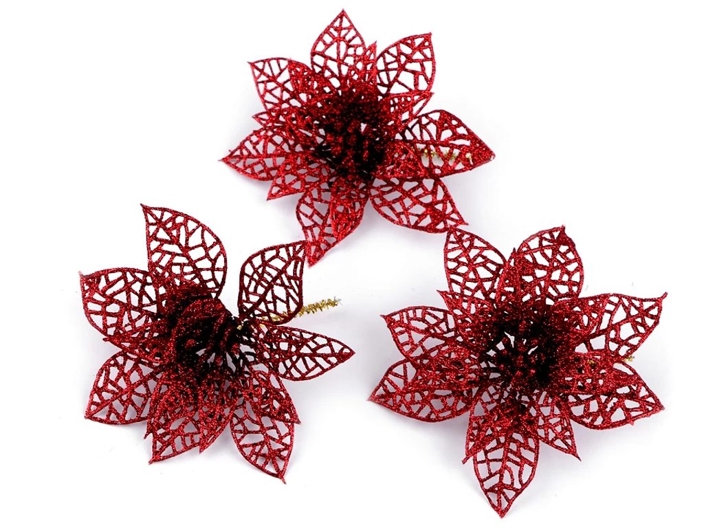 Vánoční hvězda s glitry prozáří interiér luxusem a elegancí. Poutavě se třpytí, oživí vánoční vazby, věnce, sváteční tabule či vánoční stromečky. Na spodní straně má chlupatý lurexový drátek.