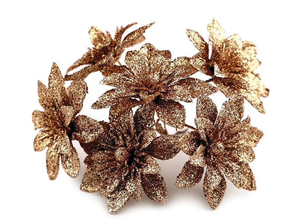Rozkvetlé vánoční hvězdy nesmí chybět v žádném vánočním aranžmá. Jejich povrch se třpytivými glitry dodá vašemu domovu nádech elegance a luxusu. Květy vánoční hvězdy jsou připevněny k ohebnému drátku, kterým lze lehce manipulovat.