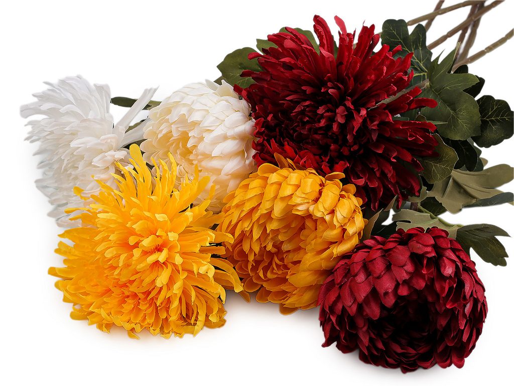 Umělá chryzantéma se pyšní svou velikostí. Květ a listy jsou textilní. Uvnitř stonku je drát. Chryzantémy vyniknou v jednoduché váze, ale také je využijete k aranžování květinových vazeb, věnců i ikeban.