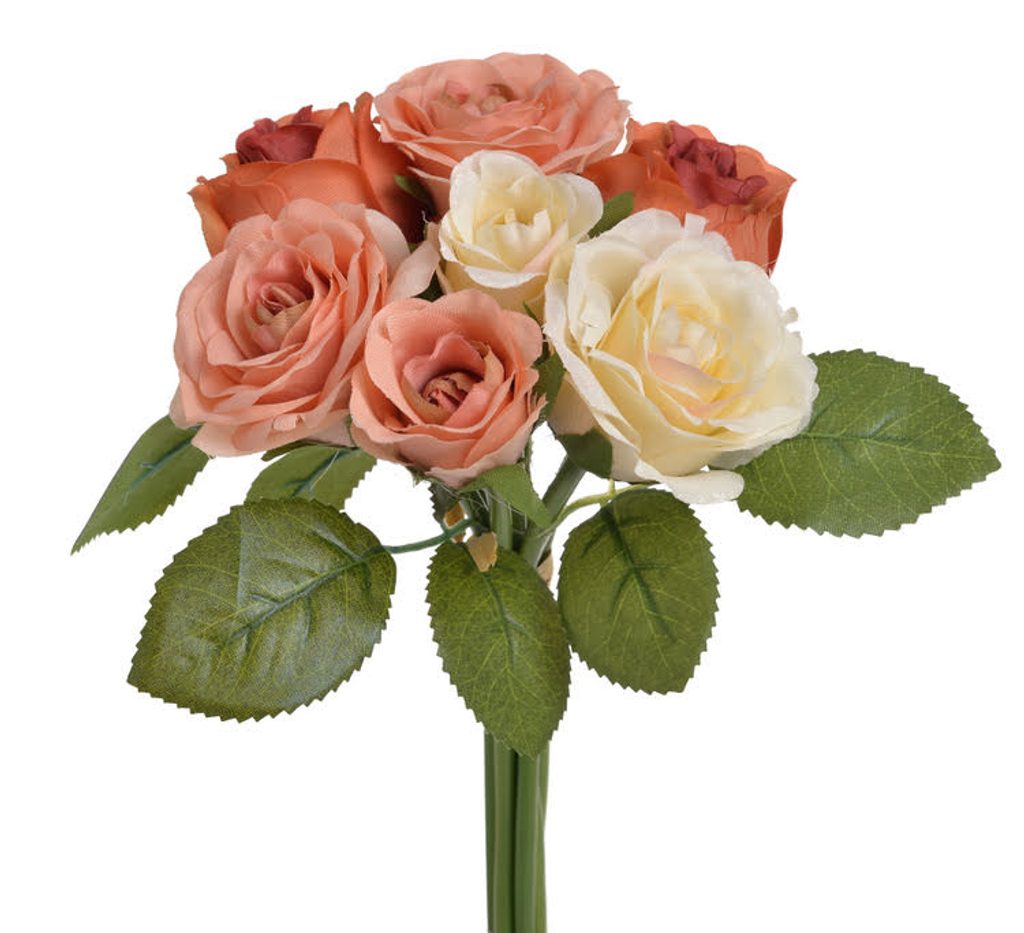 Umělá kytice růží s listy. Barvy růží v odstínech broskvové, terakoty a krémové