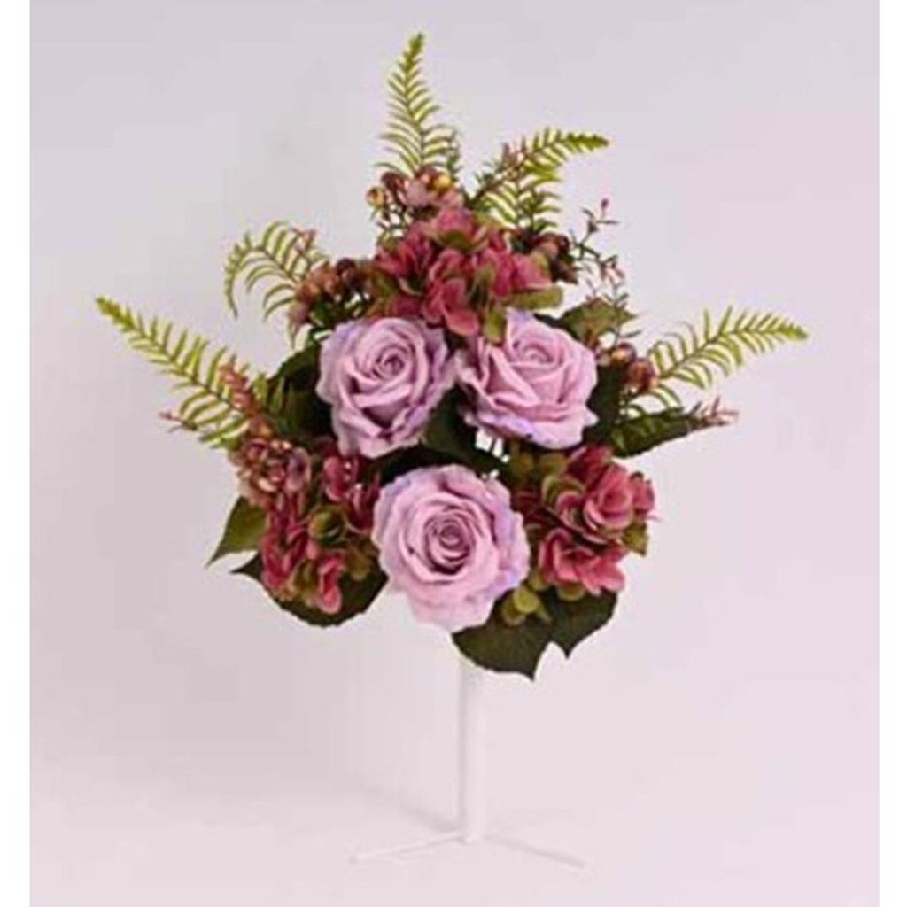 Kytice růží, hortenzie horizontální. Celková výška kytice 60 cm. Kytice má 11 stopek. Barva : fialová. Materiál : textil, plast.