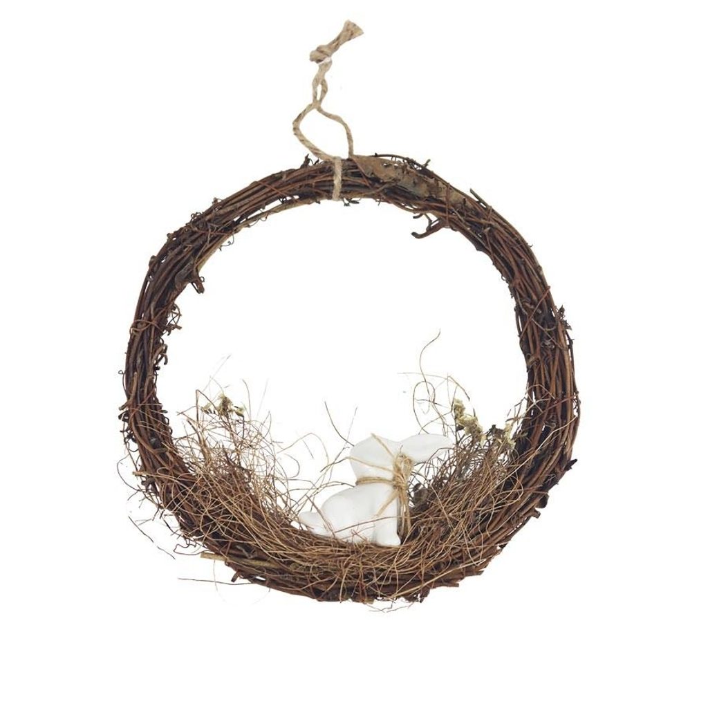 Dekorační věnec k zavěšení. Rozměry : průměr 21 cm, tloušťka 2 cm. Barva : hnědá. materiál : přírodní, keramika, juta.