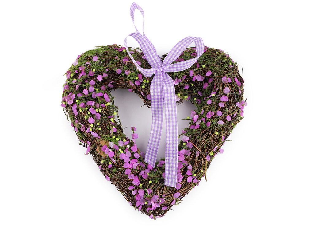 Proutěné srdce vynikne pověšené na dveřích, v oknech i na zdi. Svěží nádech mu dodávají drobné textilní okvětní lístky a umělý mech.