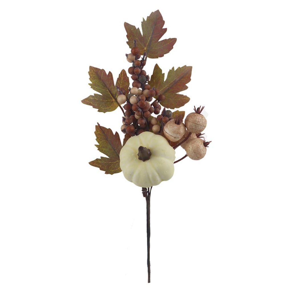 Dekorační větvička s dýní. Rozměry : 11 x 6 cm, celková délka 26 cm. Barva : kombinace hnědá, zelená. Materiál : plast.