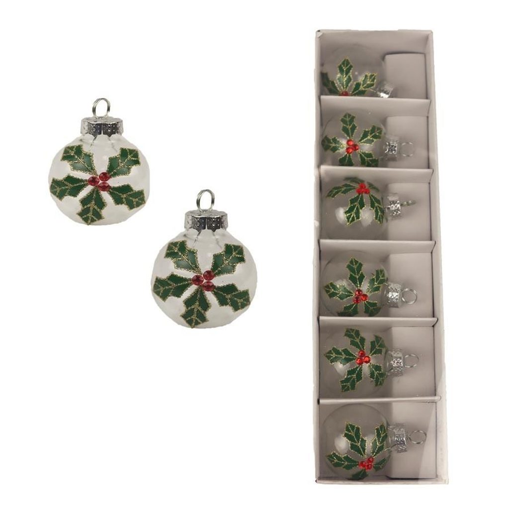 Sada vánočních dekorací. Sada obsahuje 6 dekorací. Rozměry : průměr 4 x 4,5 cm. Barva : kombinace čirá se zelenou. Materiál : sklo.
