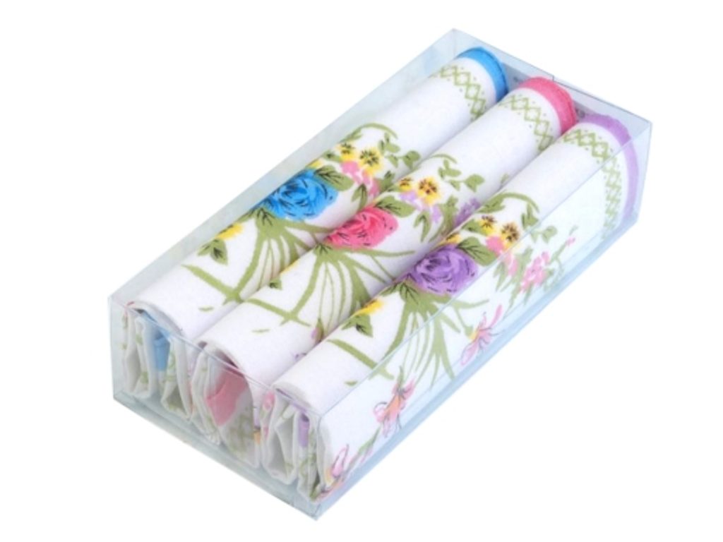 Kapesníky jsou zabalené v průhledné krabičce. V jedné krabičce jsou 3 čtvercové kapesníky.