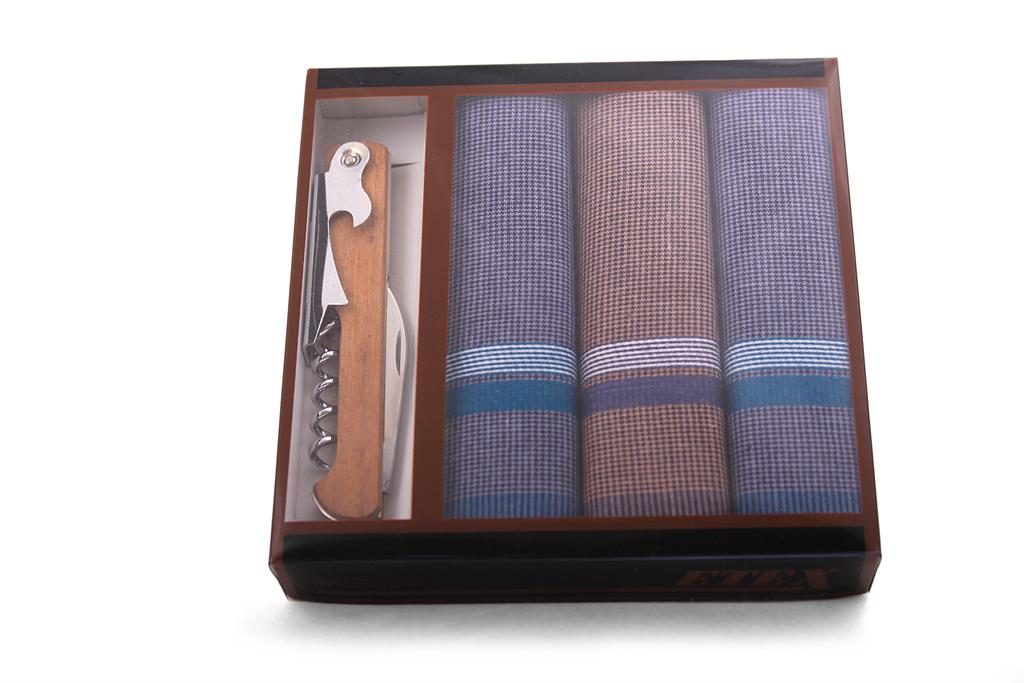 Pánská dárková sada kapesníků s kapesním nožem je vhodným a praktickým dárkem, který jistě potěší každého muže. V sadě najdete tři kapesníky a nůž. Funkce nože: nůž, vývrtka a otvírák. Střenka je dřevěná. Má rozměry 1,3 x 2,5 x 11 cm. Rozměry bavlněných kapesníků jsou 44 x 44 cm. [Vážení zákazníci, nabízíme pouze mix světlý a mix tmavý, z důvodů neustálé jiné skladby vzorů kapesníků. Děkujeme za pochopení.]