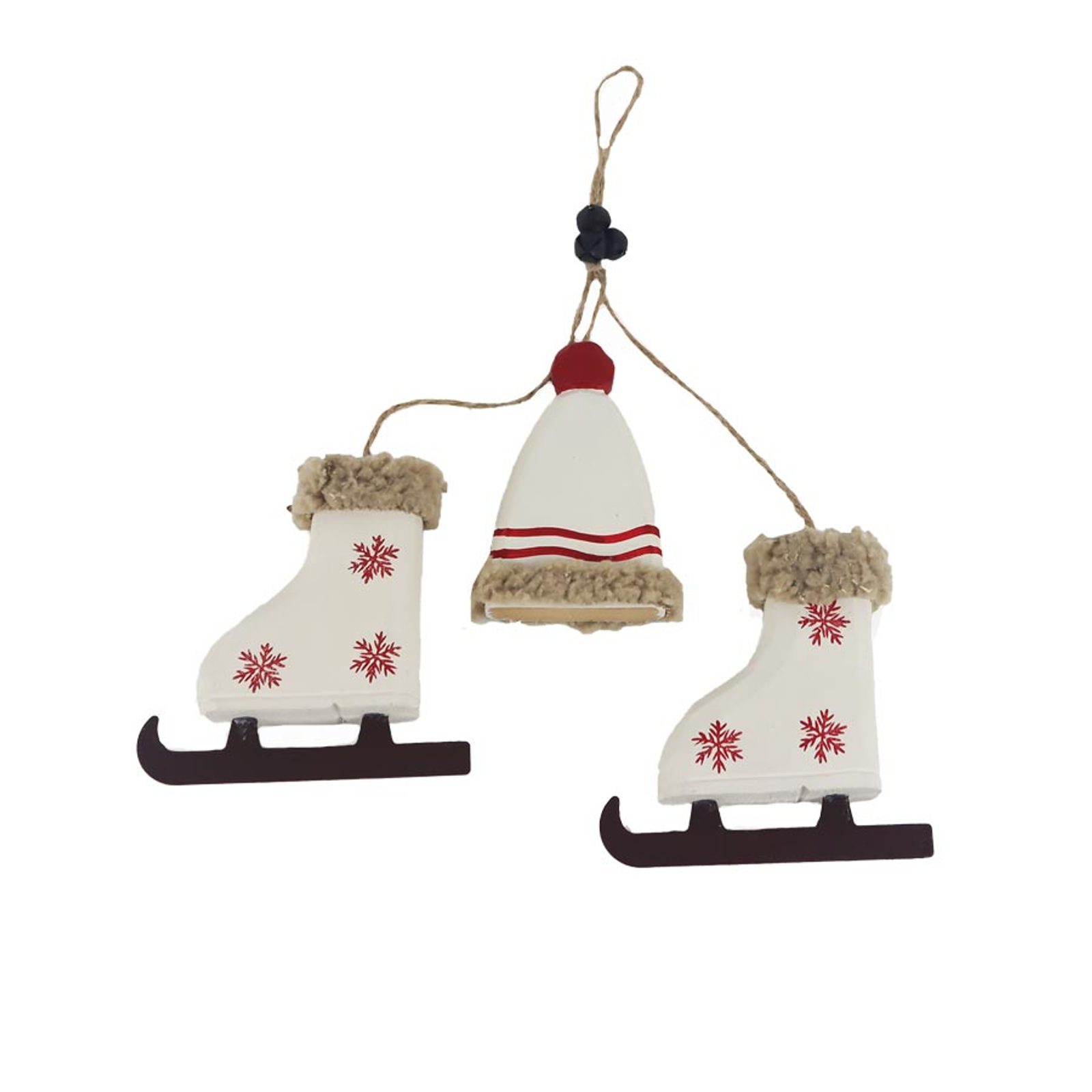 Dekorační brusle k zavěšení. Rozměry : 18 x 2,5 cm, celková délka 25 cm. Barva : kombinace bílá, hnědá, červená. Materiál na bázi dřeva, kov.