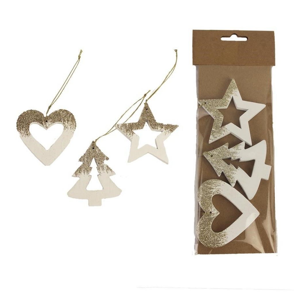 Sada dekorací k zavěšení. Sada obsahuje 3 dekorace. Rozměry : 6 - 7 x 0,7 cm, výška 6,5 - 7 cm. Barva : kombinace bílá se zlatou. Materiál na bázi dřeva.