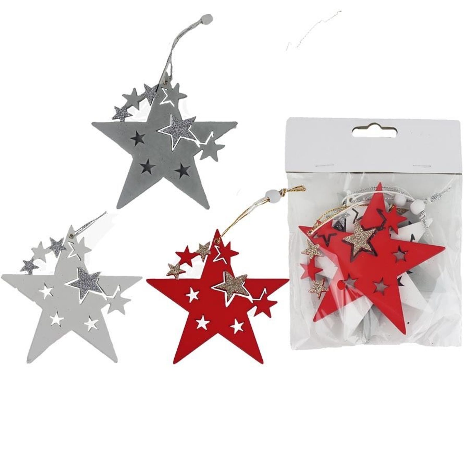Sada dekoračních hvězd k zavěšení. Sada obsahuje 3 hvězdy. Rozměry : 10 x 10 cm, tloušťka 0,5 cm. Barva : kombinace šedá, červená, bílá. Materiál na bázi dřeva.