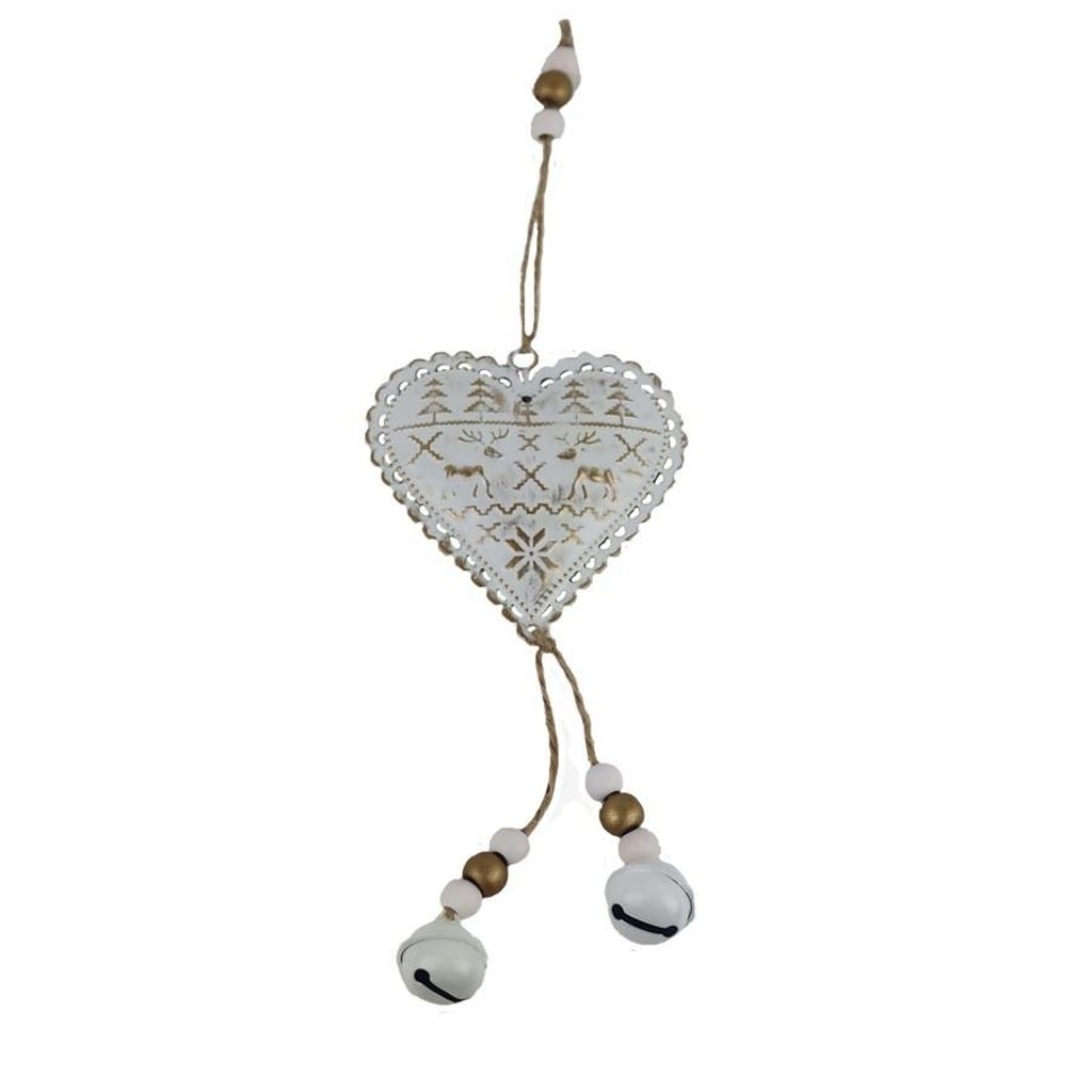 Dekorační srdce k zavěšení. Rozměry : 8,5 x 8,5 cm, tloušťka 1,5 cm, celková délka 28 cm. Barva : kombinace bílá se zlatou. Materiál : kov.