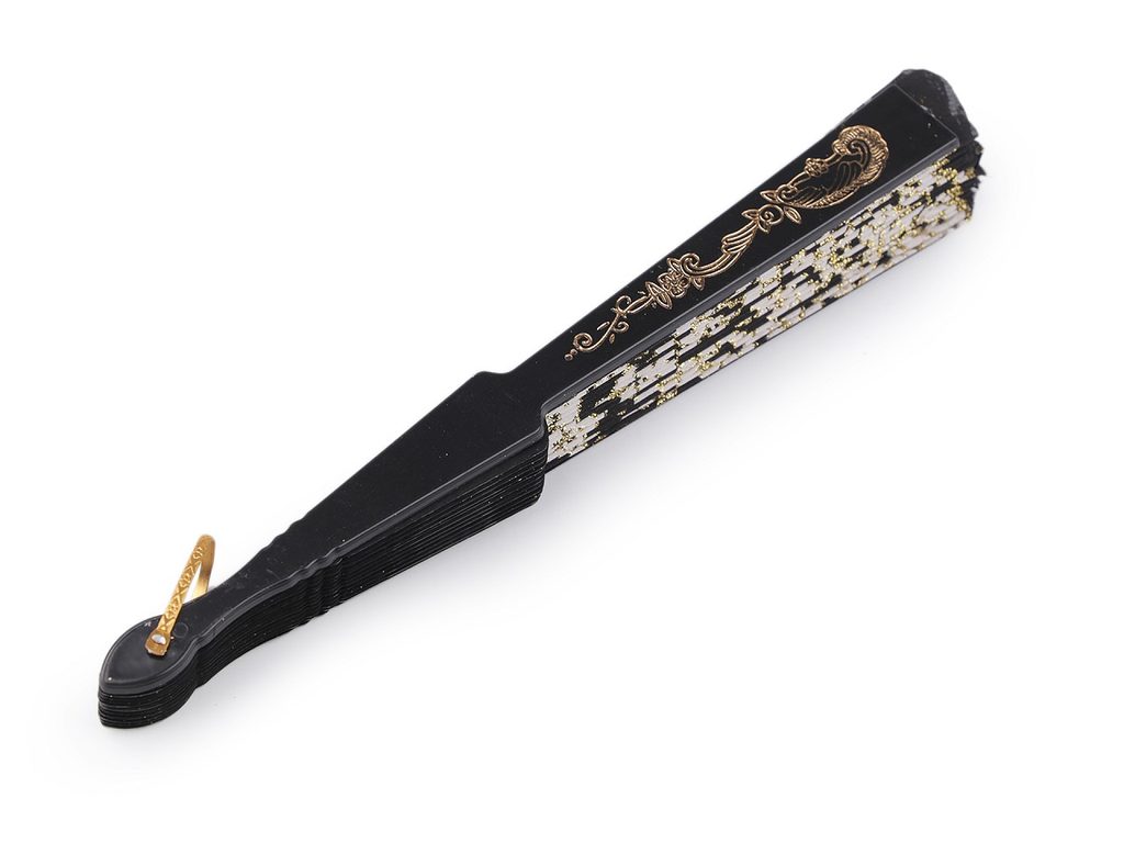 Textilní vějíř s glitry se hodí na společenské události, karnevaly i různá taneční vystoupení. Rukojeť je plastová s poutkem.