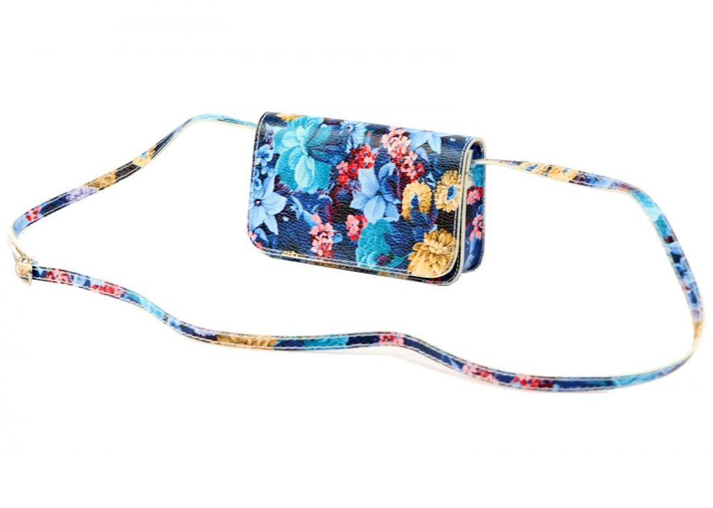 Kožená modrozelená dámská podélná crossbody kabelka v motivu květů