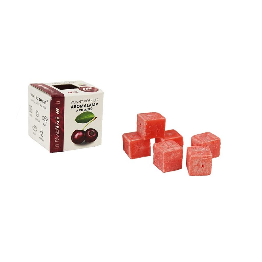 Vonný vosk - DIVOKÁ VIŠEŇ. Krabička má rozměry 4 x 4 x 4 cm. Krabička obsahuje 8 kostek vosku o velikosti 1,5 x 1,5 x 1,5 cm. Vosk můžete použít do elektrických aromalamp i do aromalamp na čajovou svíčku. Také můžete vosk použít v interiéru - kam vosk položíte, tam voní.