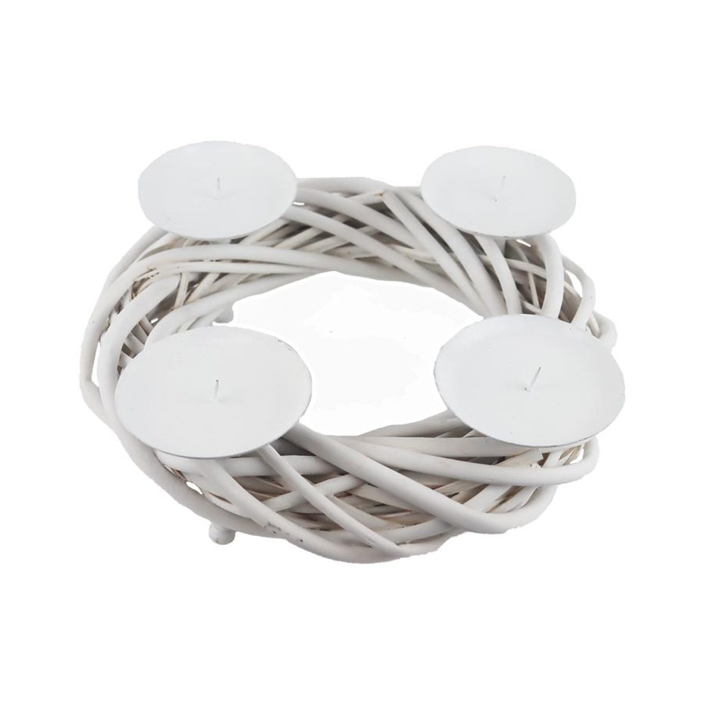 Adventní věnec. Rozměry : průměr 25 cm, výška 8 cm. Barva : bílá. Materiál : přírodní, kov.