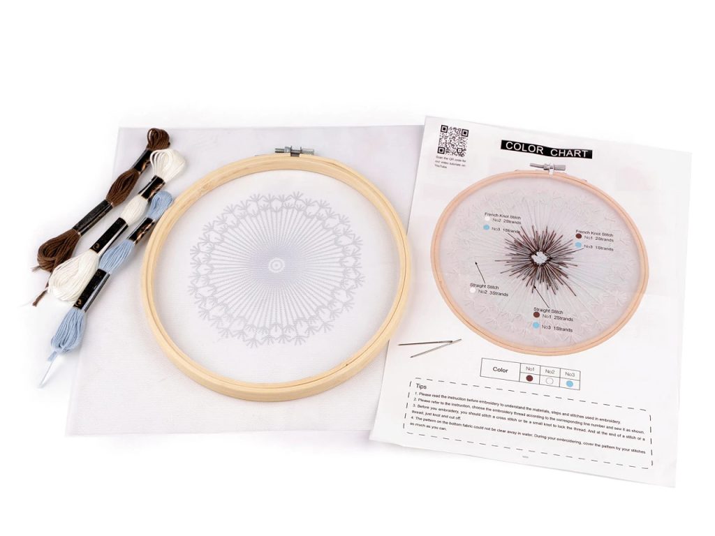 V sadě najdete tkaninu s předlohou, sadu barevných přízí, obrázkový návod, vyšívací jehly a bambusový kruh, který vám poslouží rovněž jako rámeček pro hotový obrázek.