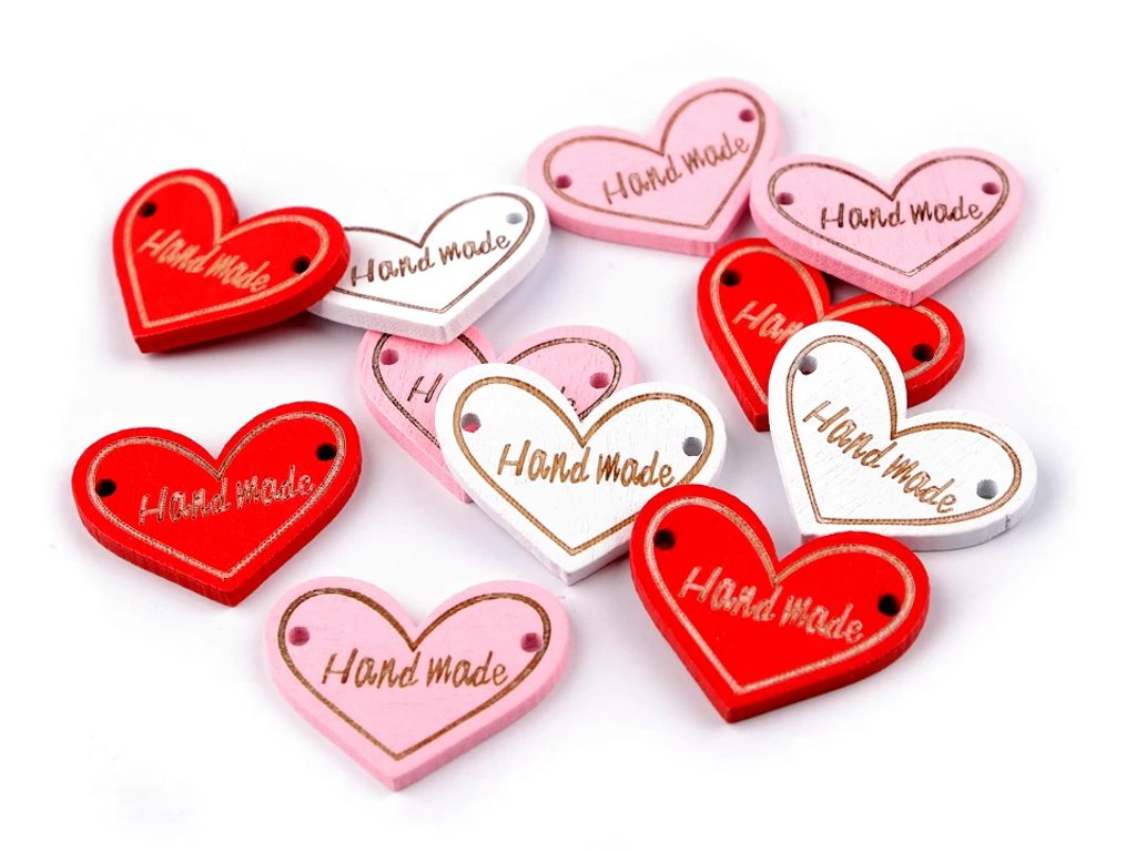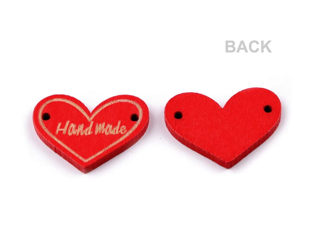 Dřevěnou cedulku ve tvaru srdce zdobí jednostranný vyřezaný nápis "Hand made". Po stranách jsou dírky, kterými lze provléct šňůrku a cedulku tak pověsit na dekoraci. Cedulky můžete našít jako štítek na ručně dělané výrobky, například tašky, pouzdra nebo ozdobné květináče. Další využití najdou i u scrapbookingu, kde je můžete nalepit na alba, přáníčka, jmenovky či zabalené dárky.