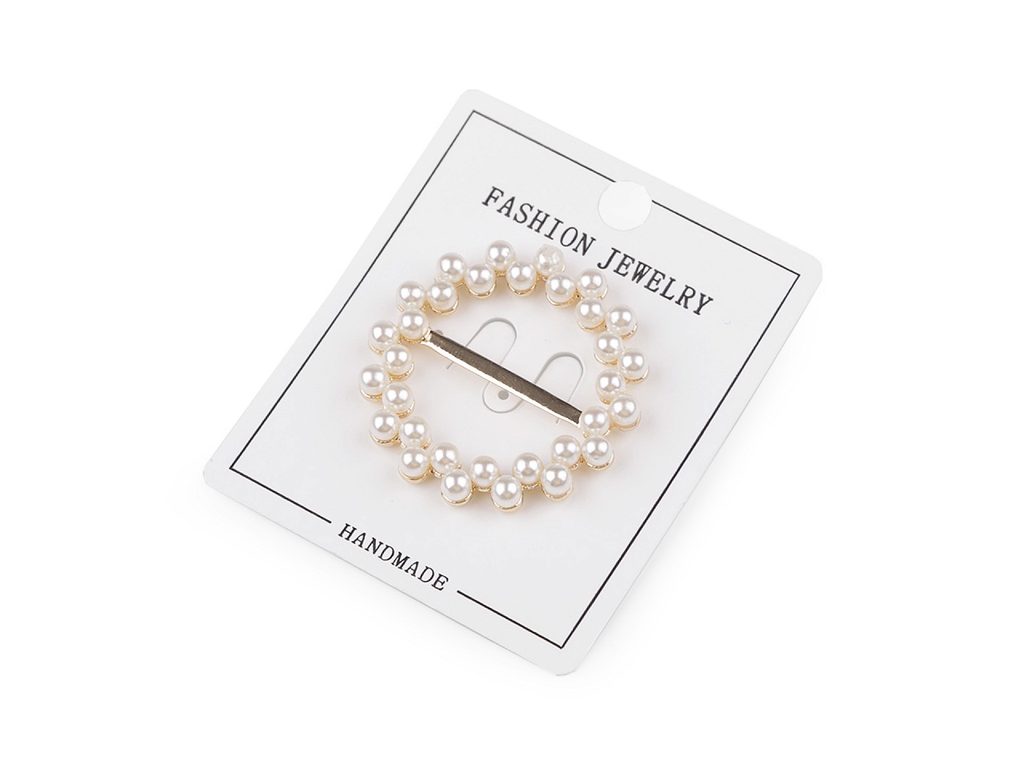Kulatá perlová spona je velice elegantní. Uprostřed má tyčinku, přes kterou můžete provléct stuhu. Můžete ji využít i na provlečení šátku. Hodí se jako dekorace na svatební polštářky a kytici pro nevěstu. Působivě vynikne jako doplněk na kabelkách, kloboucích a fascinátorech, ale také na oděvech. Můžete ji připevnit na stuhu nebo přišít přímo k látce.