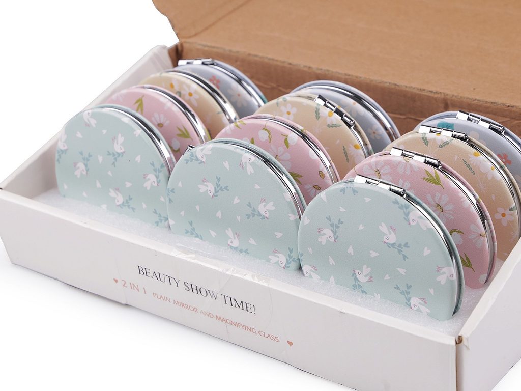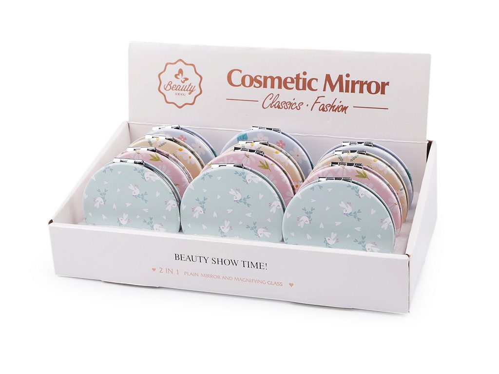 Zrcátka v balení mix 12 ks jsou zabalená v papírové krabici. Uvnitř má stojánek, hodí se k vystavení do prodejny, viz foto. Krabice má rozměry 13 x 24 x 8 cm.
