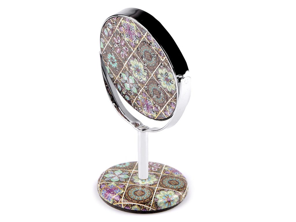 Stolní kosmetické zrcátko si postavíte na stůl i parapet okna, kde je denní světlo nejlepší. Vzadu má potisk mandal, hodí se pro kontrolu a opravu make-upu, úpravu obočí apod. Úhel sklonu si můžete nastavit bez omezení. Má kvalitní zpracování z eko kůže, zadní obrázek je dozdobený třpytivými broušenými kamínky.